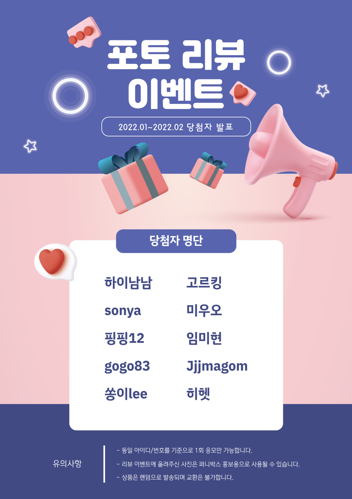 1월,2월 포토리뷰이벤트에 참여하신 분들께 감사드립니다.