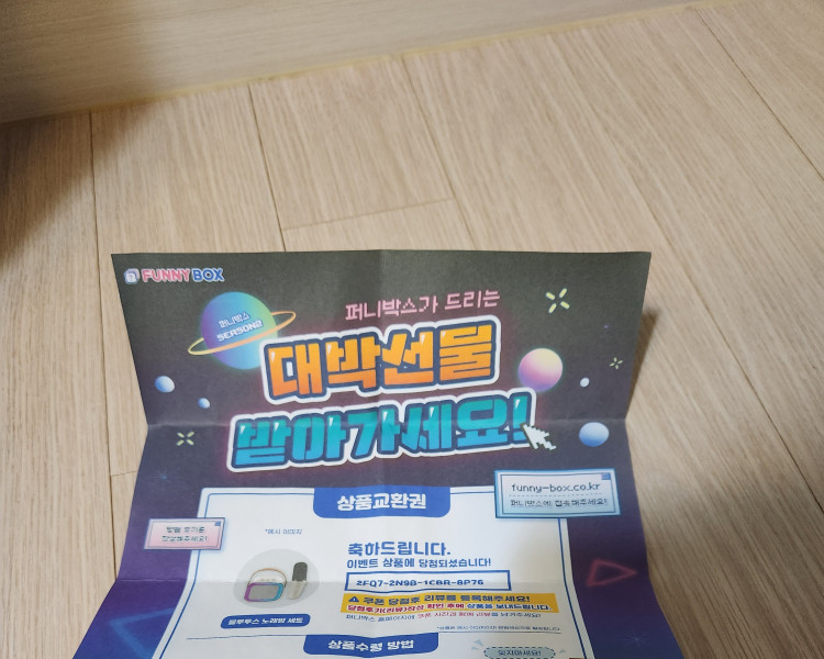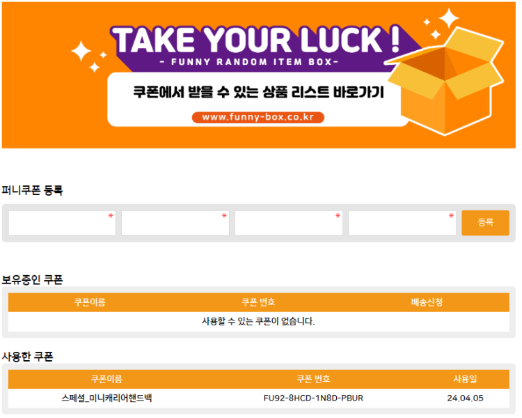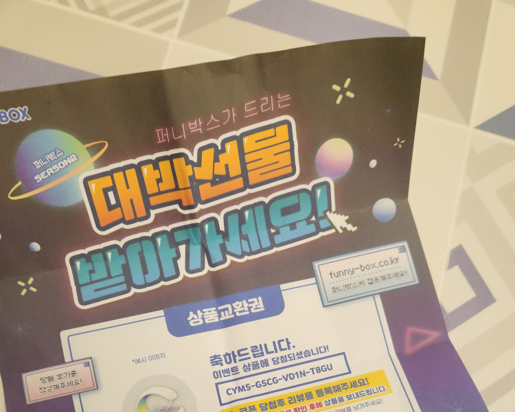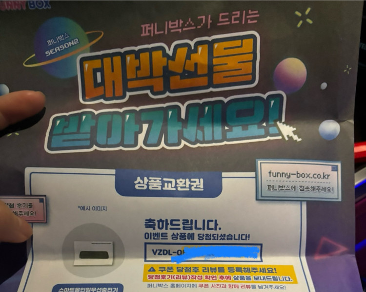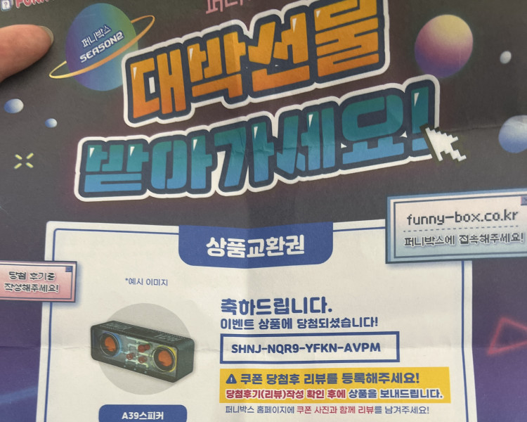 안녕하세요 퍼니박스는 쿠폰 당첨시 쿠폰으로 상품을 구매하시고 이 게시판에 쿠폰 후기사진까지 등록을 완료해주셔야 상..