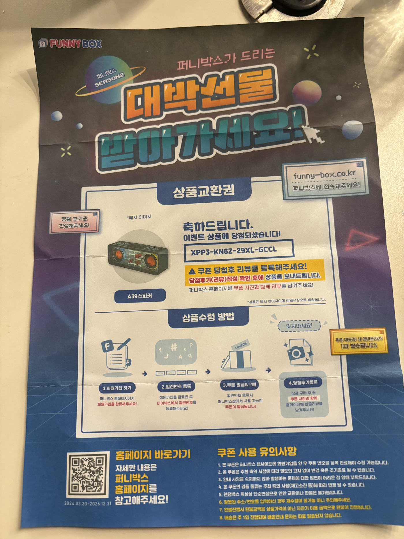 인증후기 남깁니다 페이지 정보 본문 퍼니박스 당첨 인증 및 후기 게시판입니다. 당첨 쿠폰을 사진과 함께 멋진 리뷰를 남겨주세요~ 이전글무선충전기 당첨이요~^^ 24.04.14 다음글당첨 인증합니다~ 24.04.13 목록 댓글 0 댓글목록 등록된 댓글이 없습니다.