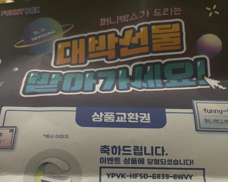 코엑스에 놀러갔더가 퍼니박스에 당첨됐네요 ㅎㅎ 첨엔 뭔지 몰랐는데 재밌는 이벤트를 알게됐어요 ㅎㅎ 담에 또 다른걸로 기대..