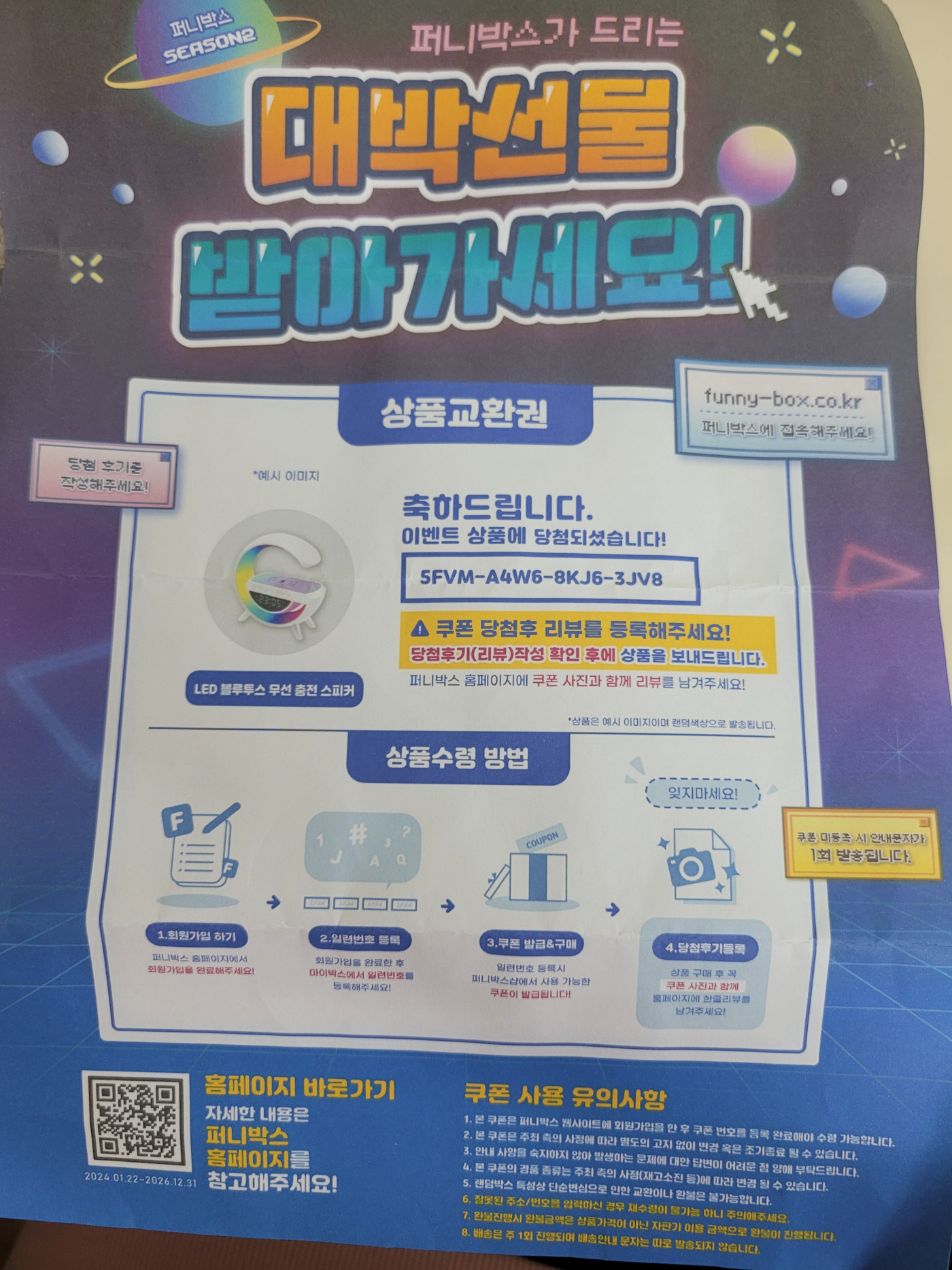 제주 가족여행을 마무리하며 공항근처에서 퍼니박스를 뽑았습니다. 큰 기대를 한 것도 아닌데 블루투스 무선 충전기를 받게 되서 깜짝 놀라고 무척 기분이 좋았습니다
