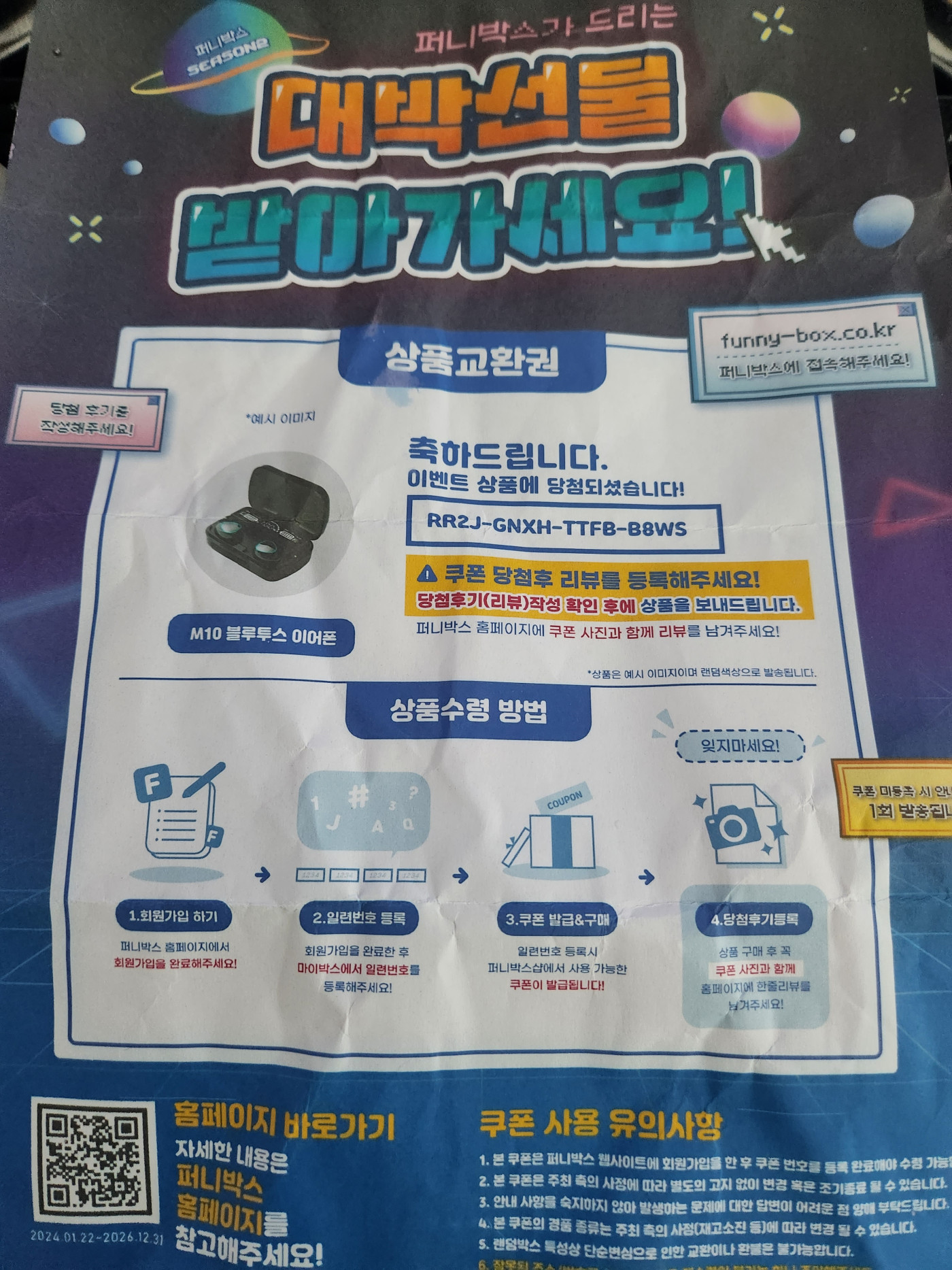 블루투스 이어폰 당첨됫어요!! 페이지 정보 본문 제주도 여행 갔는데 버스 기다리다가 심심해서 했는데 당첨 됫어요 너무 좋아요~ 이전글스맞드올인원충무선충전기 24.02.05 다음글쿠폰 인증 시 쿠폰 번호는 가려주세요~ 24.02.05 목록 댓글 0 댓글목록 등록된 댓글이 없습니다.