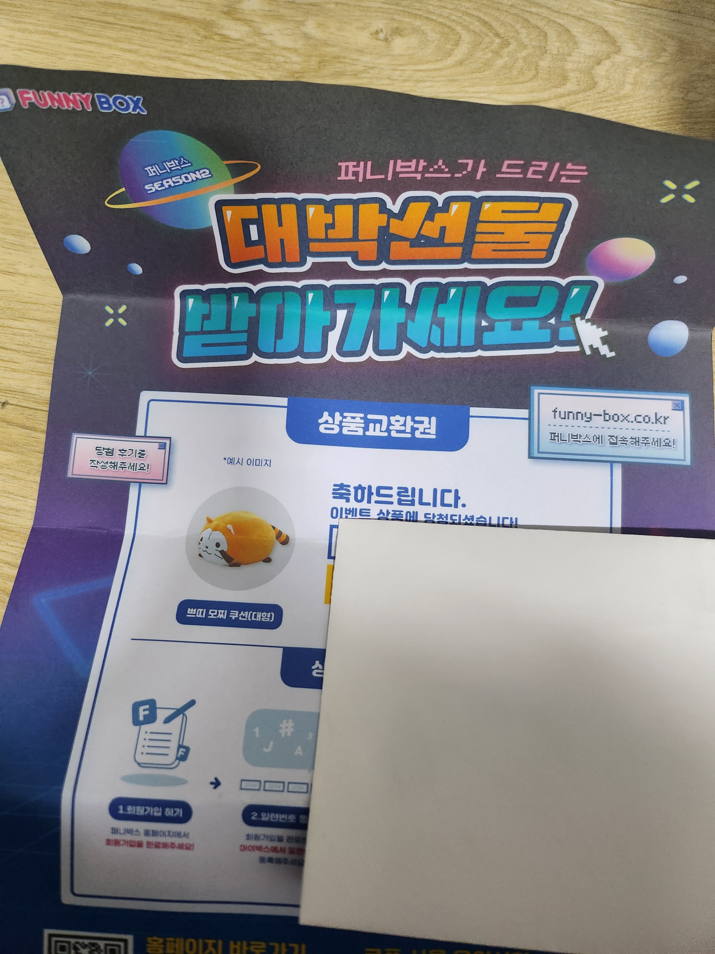 두아들이 한번씩 뽑았는데 둘째가 쁘띠모찌쿠션(대형)이 나왔네요~ 프리미어박스에다 봉투가 들어있길래! 모지!하며 두근거리며 열던 둘째가 생각나네요ㅎㅎ 원하는건 아니었어도 두근거림을 선물해주셔서 감사합니다^^