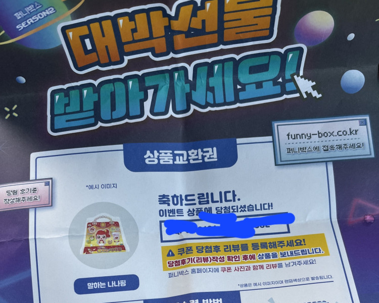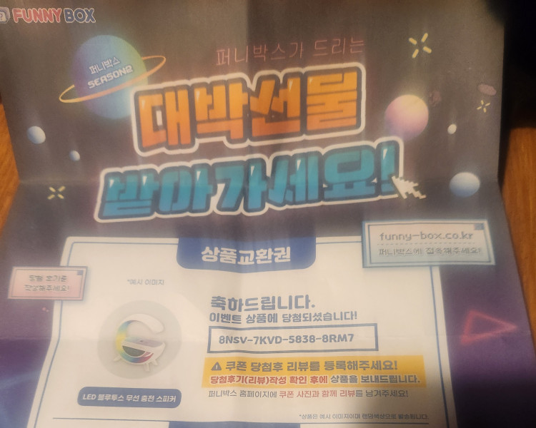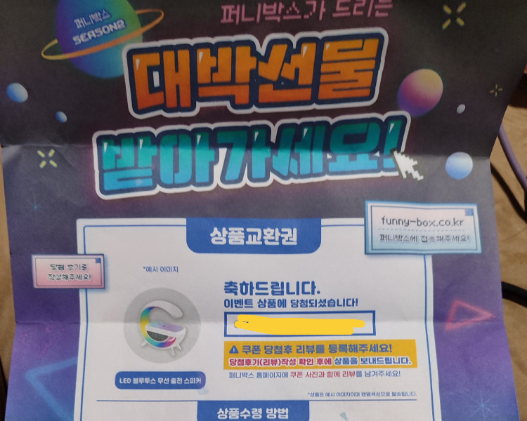 퍼니박스 당첨 인증 및 후기 게시판입니다. 당첨 쿠폰을 사진과 함께 멋진 리뷰를 남겨주세요~ 감사합다~