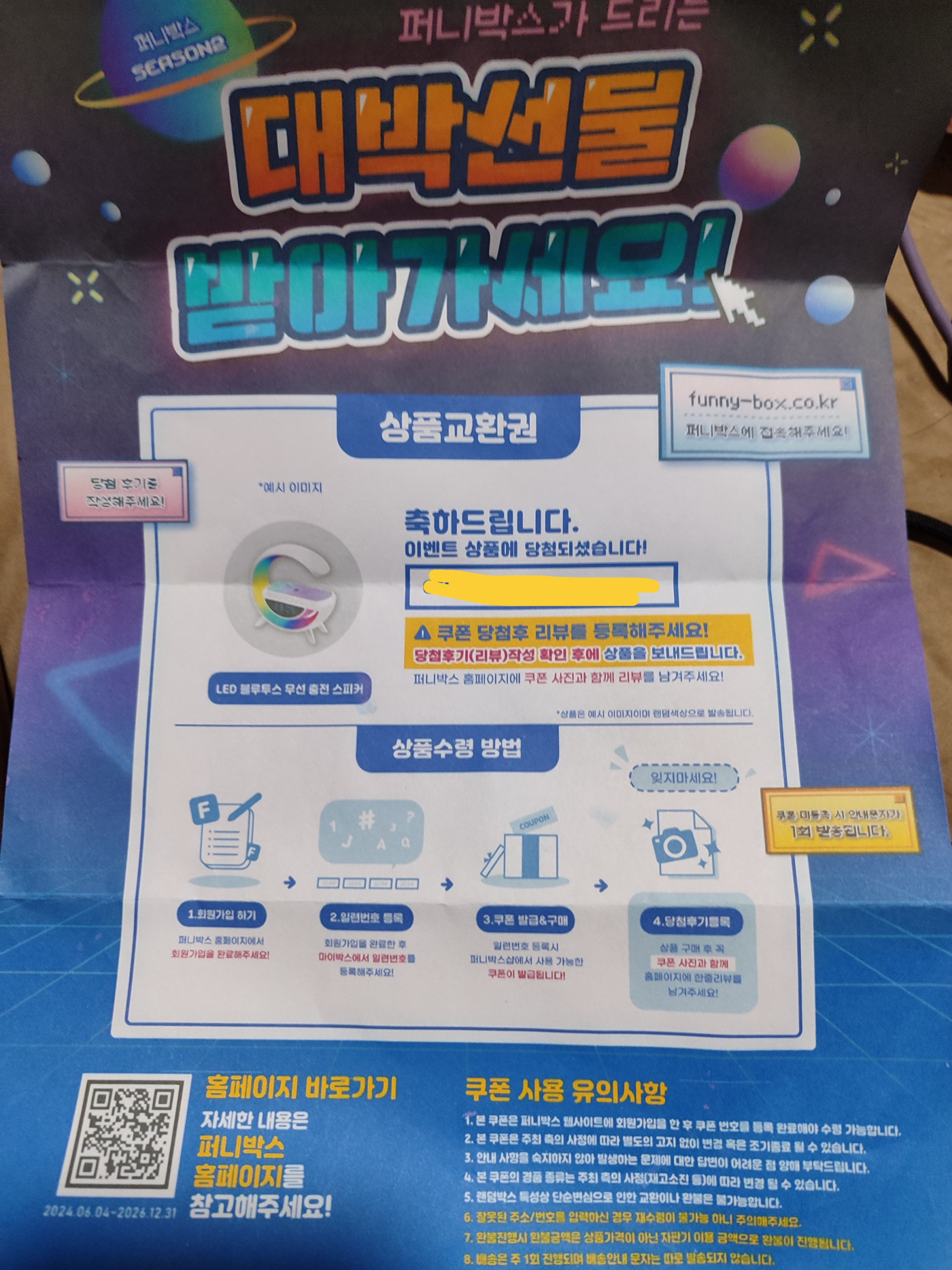 럭키박스 당첨 후기 페이지 정보 본문 제주 도두 해수 파크에서 아이가 졸라서 럭키박스 했는데, 당첨됐어요. 저는 뽑기 운이 없는데 아이는 뽑기 운이 있어서 이런 경험도 해보내요. 재미있는 추억이 됐어요. 이전글당첨~ 24.07.08 다음글볼링장 왔다가 24.07.06 목록 댓글 0 댓글목록 등록된 댓글이 없습니다.