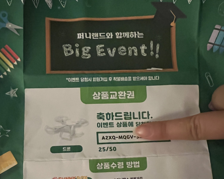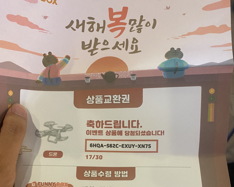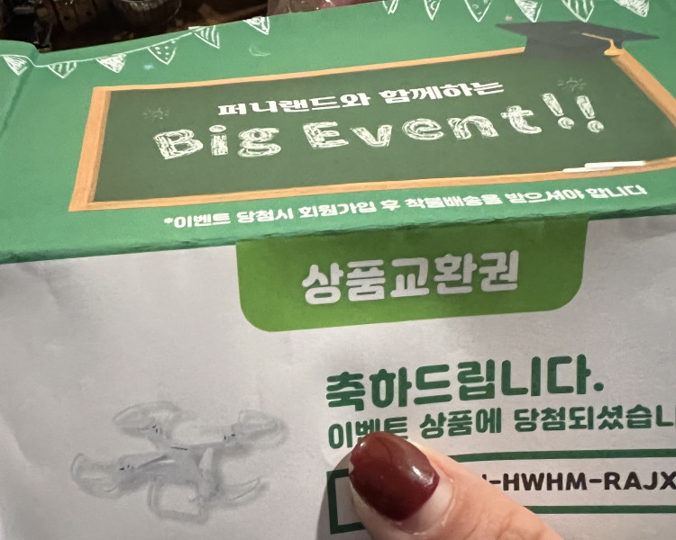 와이프랑 영화보고 심심풀이로 해봤는데 드론이 당첨되니 너무 기쁩니다. 빠른 배송 부탁드립니다.