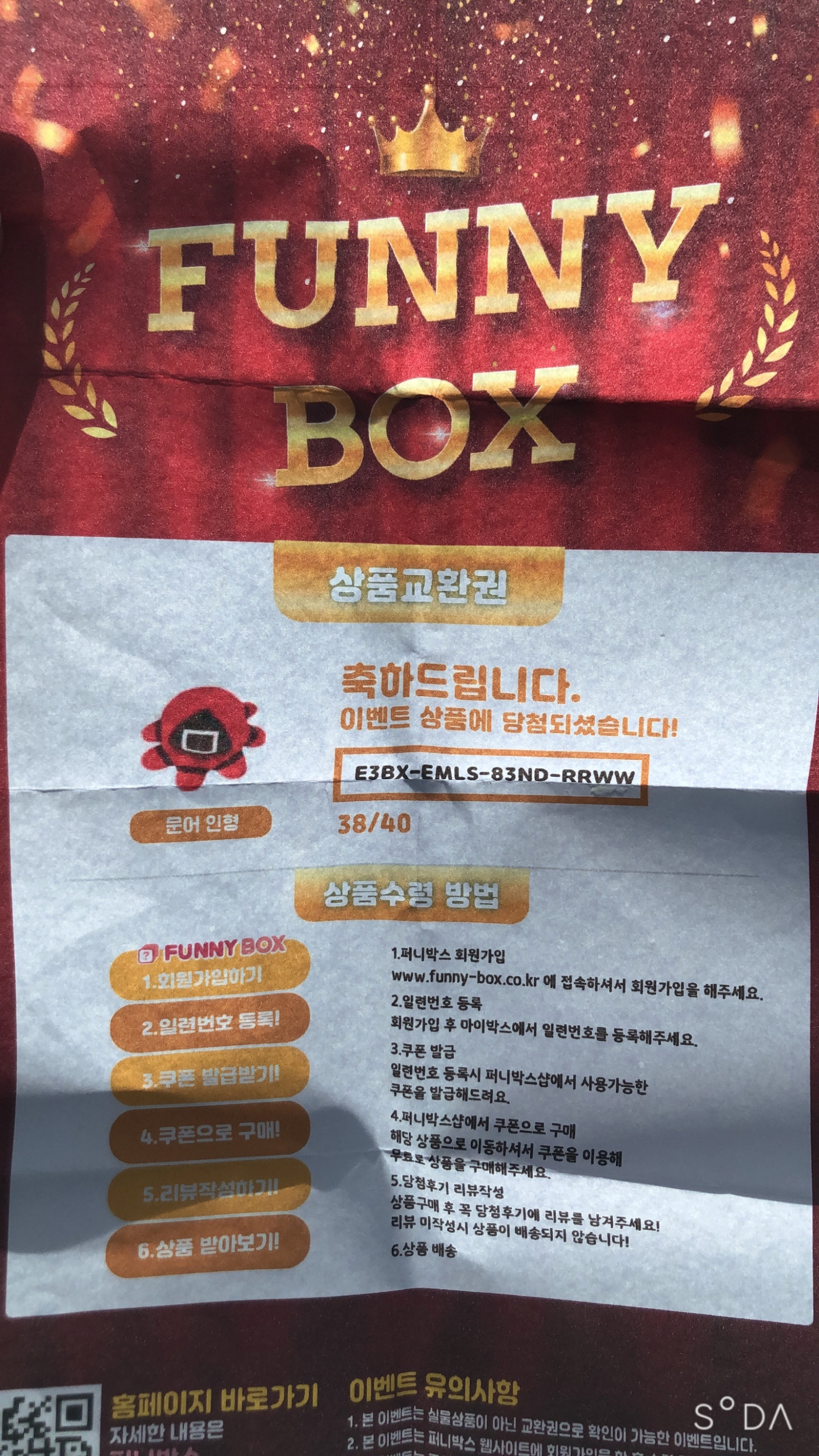 당첨후기요 페이지 정보 본문 퍼니박스 자판기 재미있어보여서 뽑아봤다가 문어인형에 당첨되었네요 ㅋㅋ 얼른 받아서 보고싶어요 빨간문어귀요미 ???? 이전글당첨 22.05.03 다음글문어인형 당첨 22.04.30 목록 댓글 0 댓글목록 등록된 댓글이 없습니다.