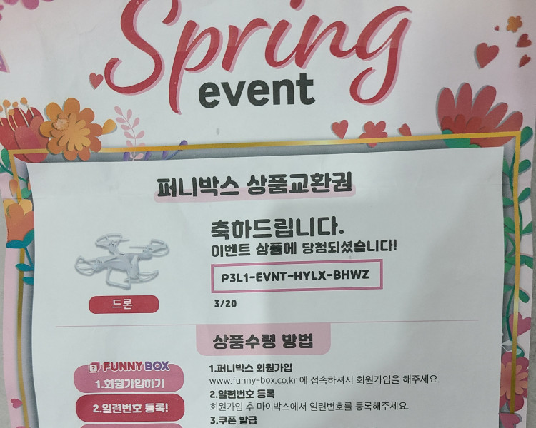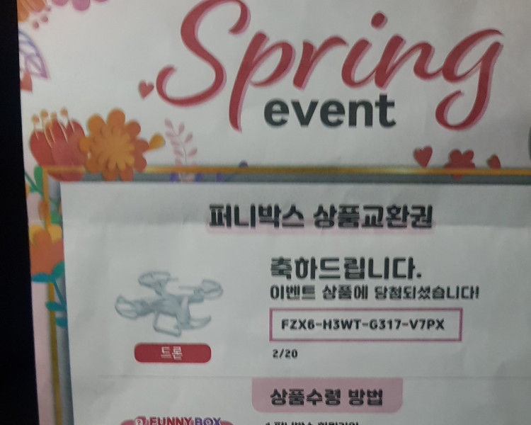 대박~~~~~!! 둘찌 뽑기로 4등 드론 걸렸어요~ㅎㅎ 첫찌는 열쇠고리구여~~ㅠㅡ 아무튼 잘 쓸께요^^