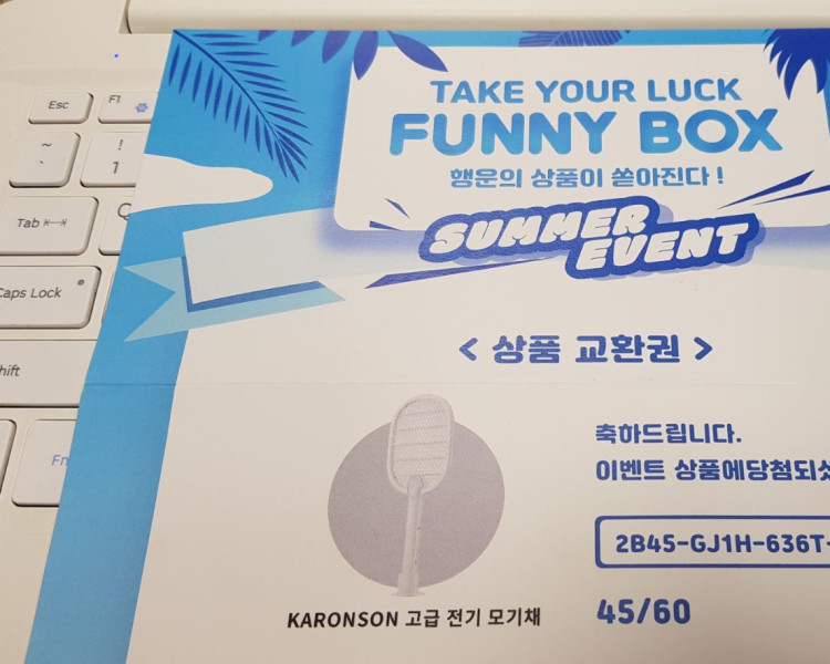 퍼니 박스 전기 모기채 당첨 됐네요. 사람들 줄서서 하길래 도전 해서, 첨엔 가벼워 실망했다가 교환권이 나와 기분..