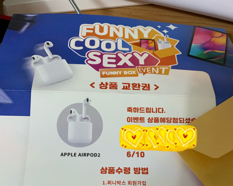 정말 기대도안하고 해봤는데 에어팟이 당첨될줄은... 감사합니다 잘쓰겠습니다ㅠㅠㅠ