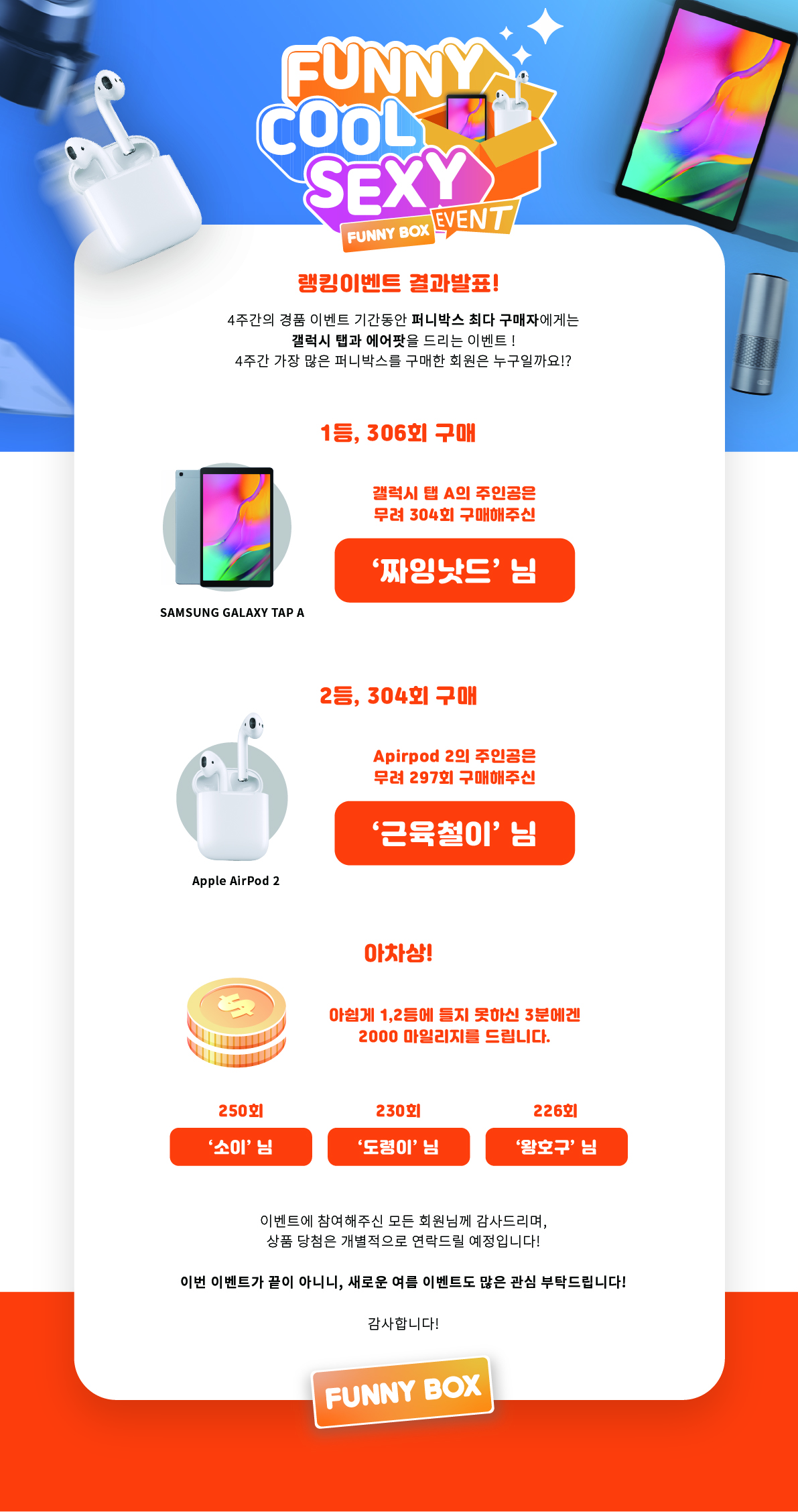 FUNNY하고 COOL한 SEXY 이벤트 랭킹 이벤트 발표 페이지 정보 본문 - 이전글서버 이전으로 인한 이용 제한 안내 20.07.16 다음글[6월 SNS인증 EVENT] 태그하고 또 받자! 이벤트 결과 발표 20.07.07 목록 댓글 0 댓글목록 등록된 댓글이 없습니다.